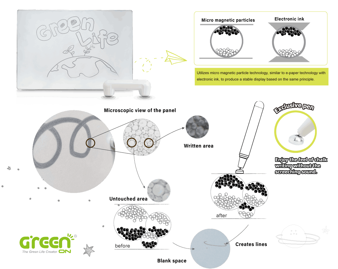 GREENBOARD magnetic electronic paperboard uses micro magnetic particle technology and exclusive nanotechnology to achieve pencil-like writing lines, and the strokes are clear and will not disappear.