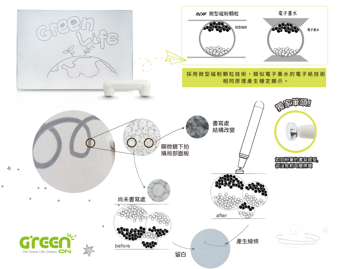 使用奈米微型磁粉技術製成的磁性電紙板,通過物理現象產生線條,搭配專用手寫筆可呈現極細緻的真實線條。專用擦拭板擦具備局部清除效果,利用電生磁技術,使得電紙板能夠無限次書寫,是一款綠色電力產品。GREENBOARD磁性電紙板系列產品,操作方便直覺,是奈米技術、人工技術和AI精密結構的結晶。