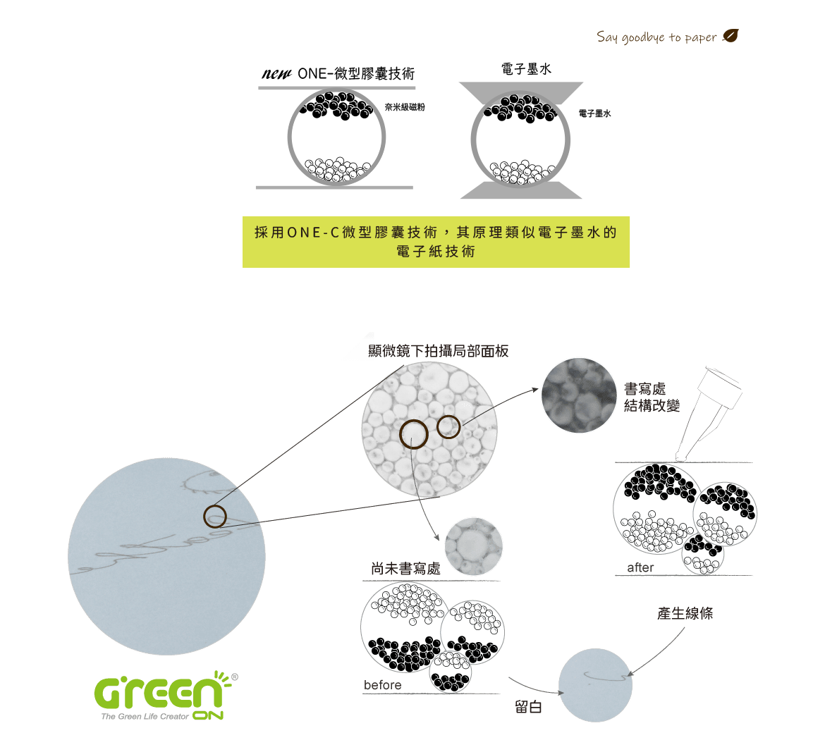 紙張科技化,電紙板再進化!終身不吃電的Green Board電紙板,高科技奈米級磁性電紙板,採用微型磁粉顆粒技術,類似電子墨水的電子紙技術,使用相同原理來產生穩定顯示。運用電生磁技術達到局部擦拭效果,面板表層採用最新模擬紙張技術,提供更好的書寫感受,模擬真實筆跡的書寫體驗。