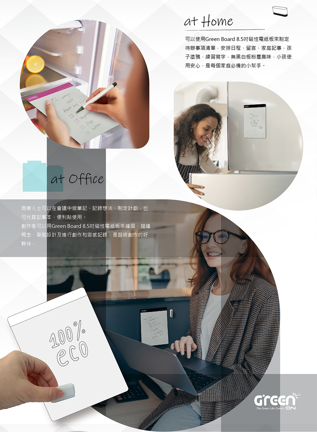 Green Board產品秉承綠色、環保與科技、生活結合的理念,在每一個需要紙張的場合提供全新的書寫工具選擇,無界限的溝通工具。Green Board 磁性手寫板為無紙化的環保書寫工具,採用了最新膠囊技術,無需電源或任何外部能源供應即可實現長期穩定的顯示效果。您可以隨意書寫、繪圖和註記,享受自由書寫的樂趣,同時為環境保護盡一份力量!